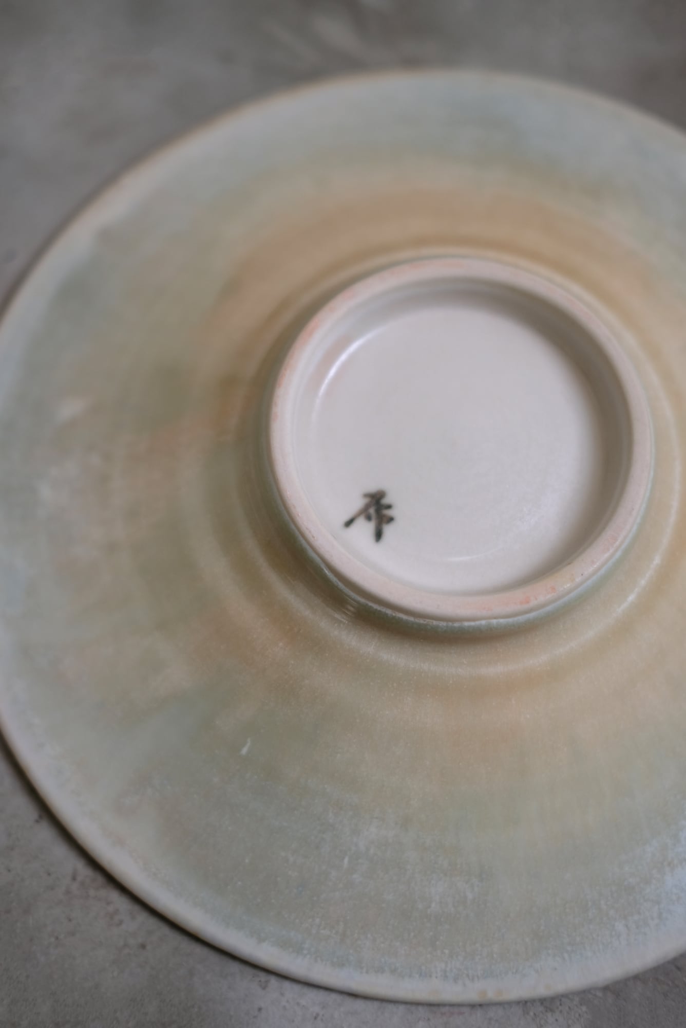 絵を描くように釉薬を重ね、偶然と必然が交わる中で多彩な表情が立ち現れる中園さんの器。流れ、にじみ、重なりあった色は、光の移ろいに呼応しながら、ひとつとして同じもののない景色をうつわの中に見せてくれます。