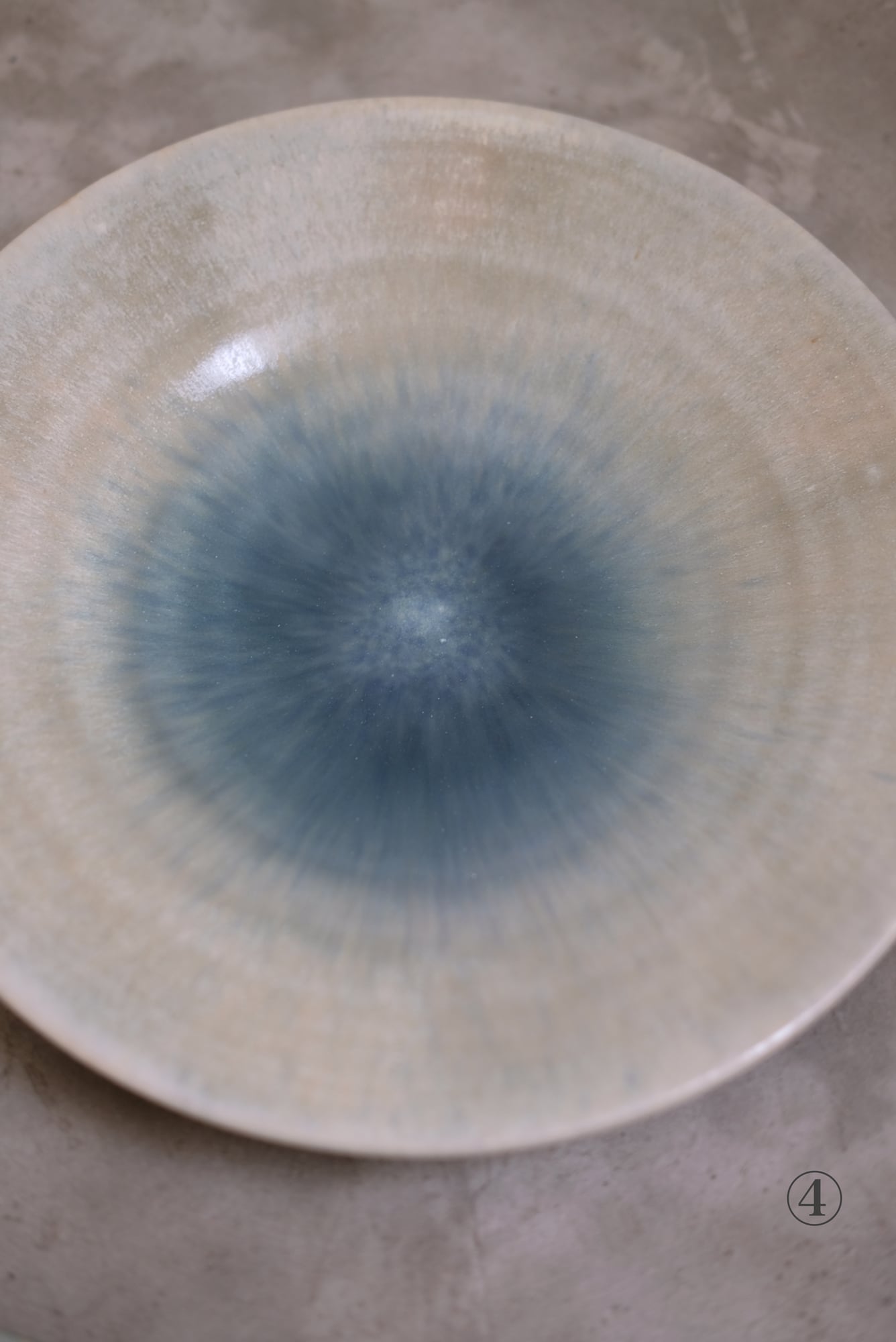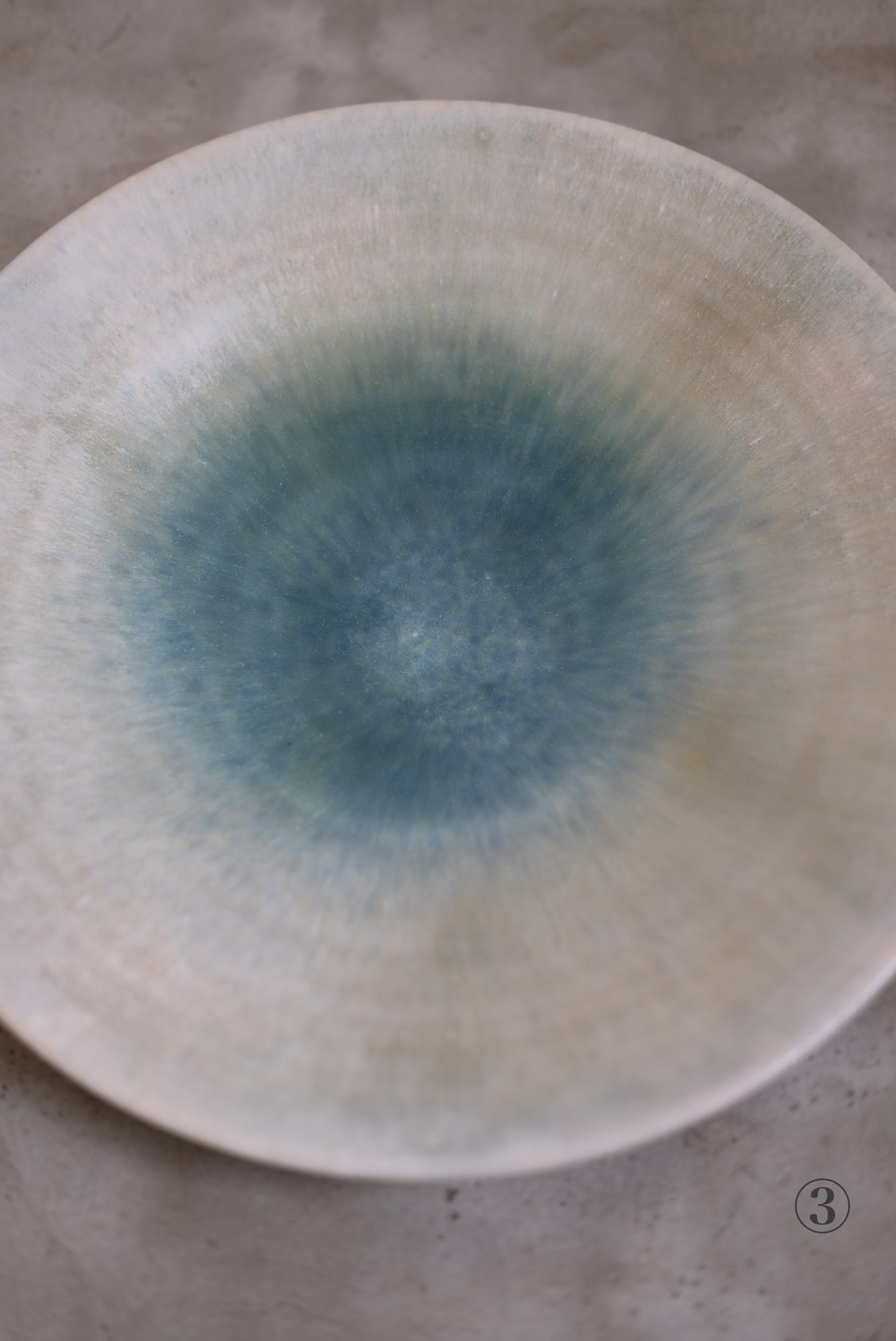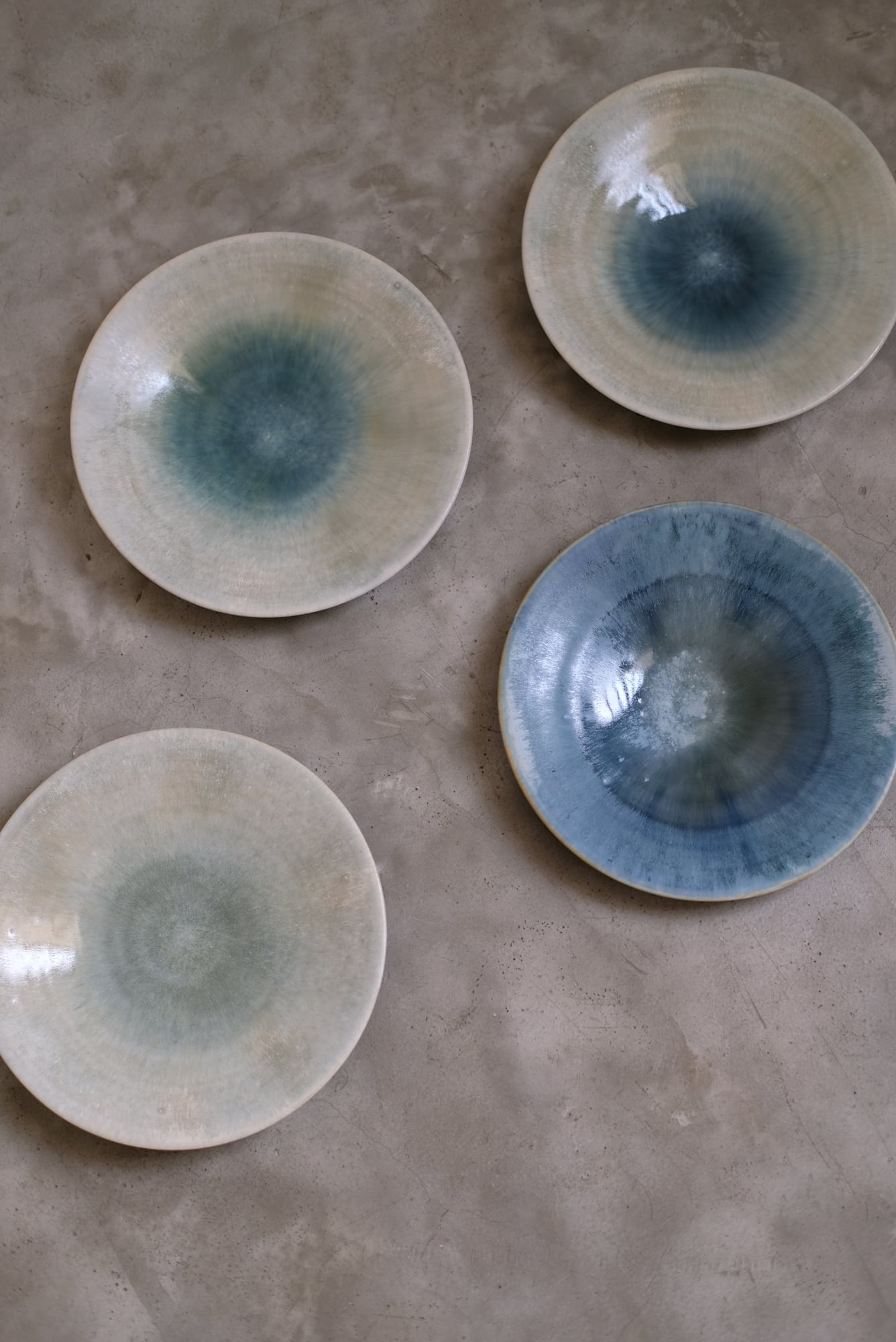 絵を描くように釉薬を重ね、偶然と必然が交わる中で多彩な表情が立ち現れる中園さんの器。流れ、にじみ、重なりあった色は、光の移ろいに呼応しながら、ひとつとして同じもののない景色をうつわの中に見せてくれます。