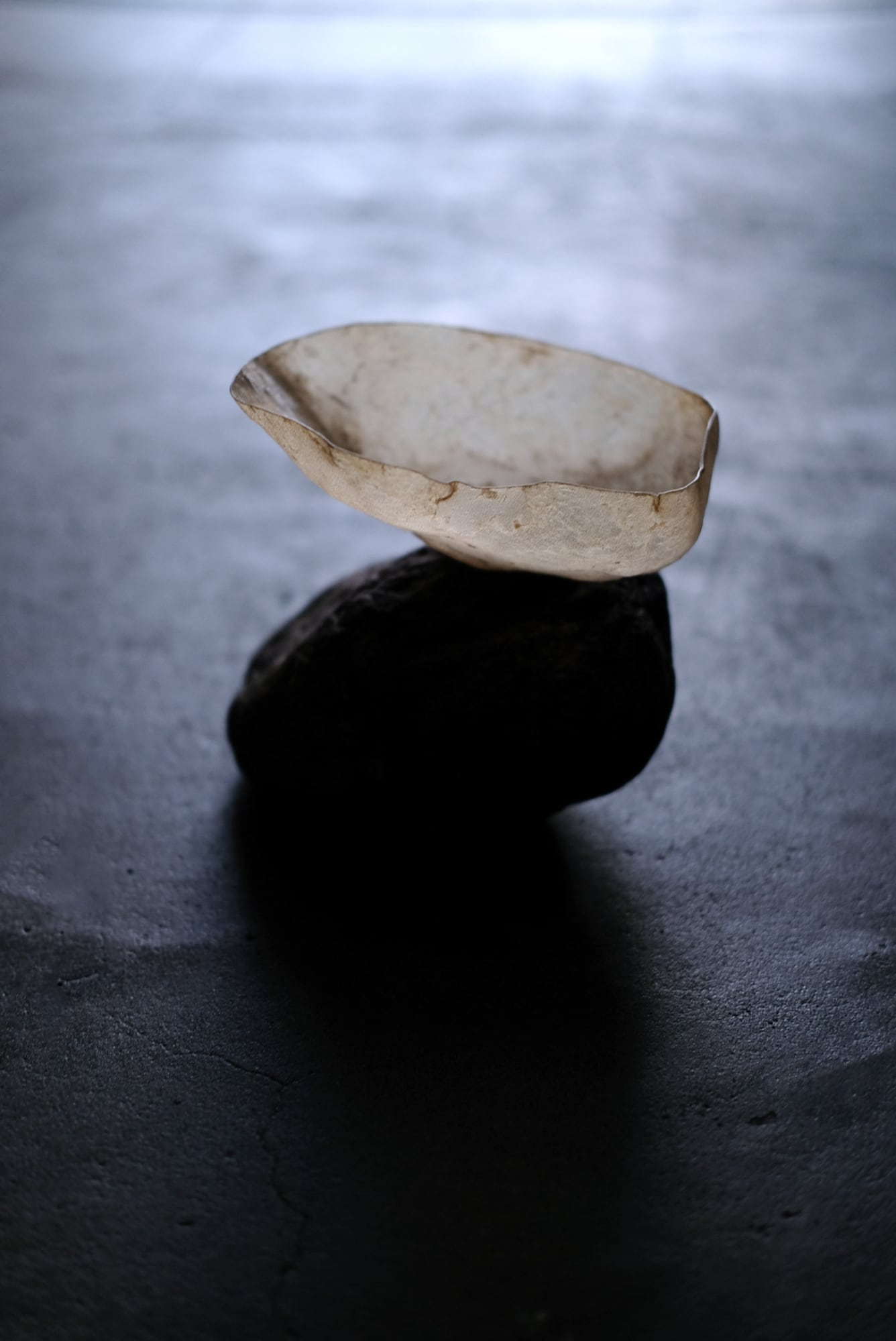 石そのものと、石の形を写し取った鹿皮の器状造形。石は実像、皮は虚像。しかし重ねれば一つの実となり、離せばそれぞれが独立した存在として成立します。薄い鹿皮は高い透化性を持ち、石の輪郭や光を柔らかく映し出します。乗せる、収める、離す、関係性の変化によって表情が変わります。