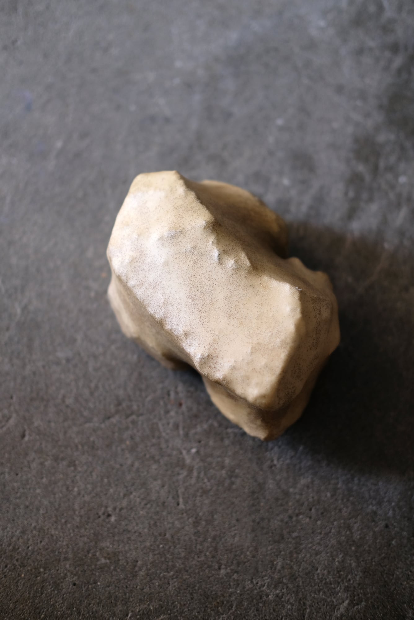川原で拾った、あえて丸くない角のある石。形が予測できず、コントロールしきれない形、作為を抑えたその状態。透けた皮越しに、石の存在が浮かび上がります。