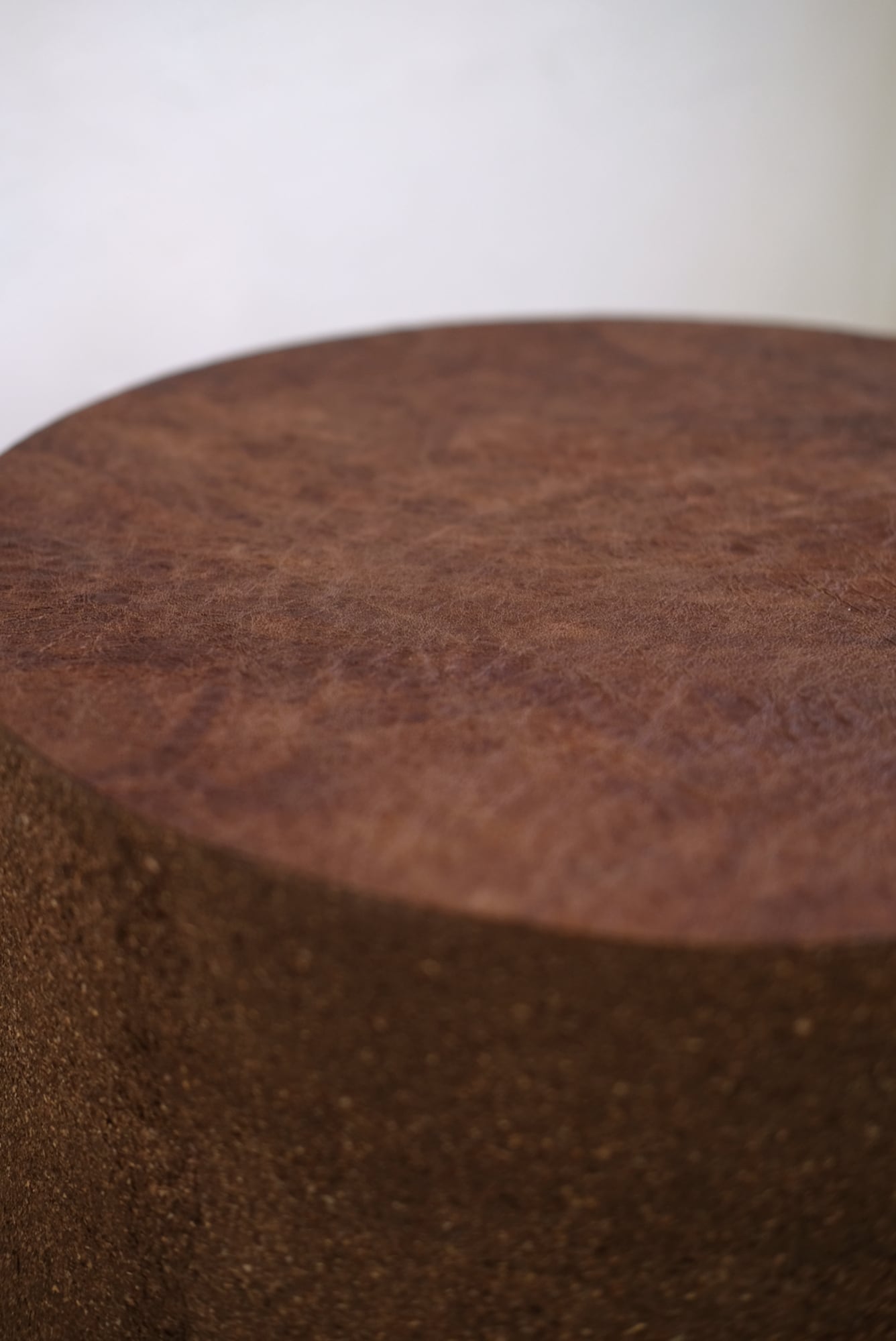 切り出した合板を積層し、どの角度から見ても動きのある柔らかな曲線があります。座面は染めた鹿皮、側面と底は落ち葉。