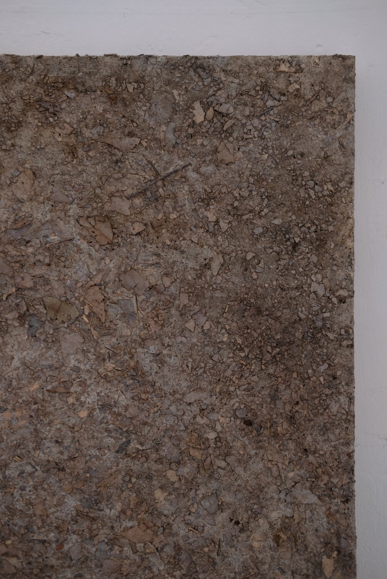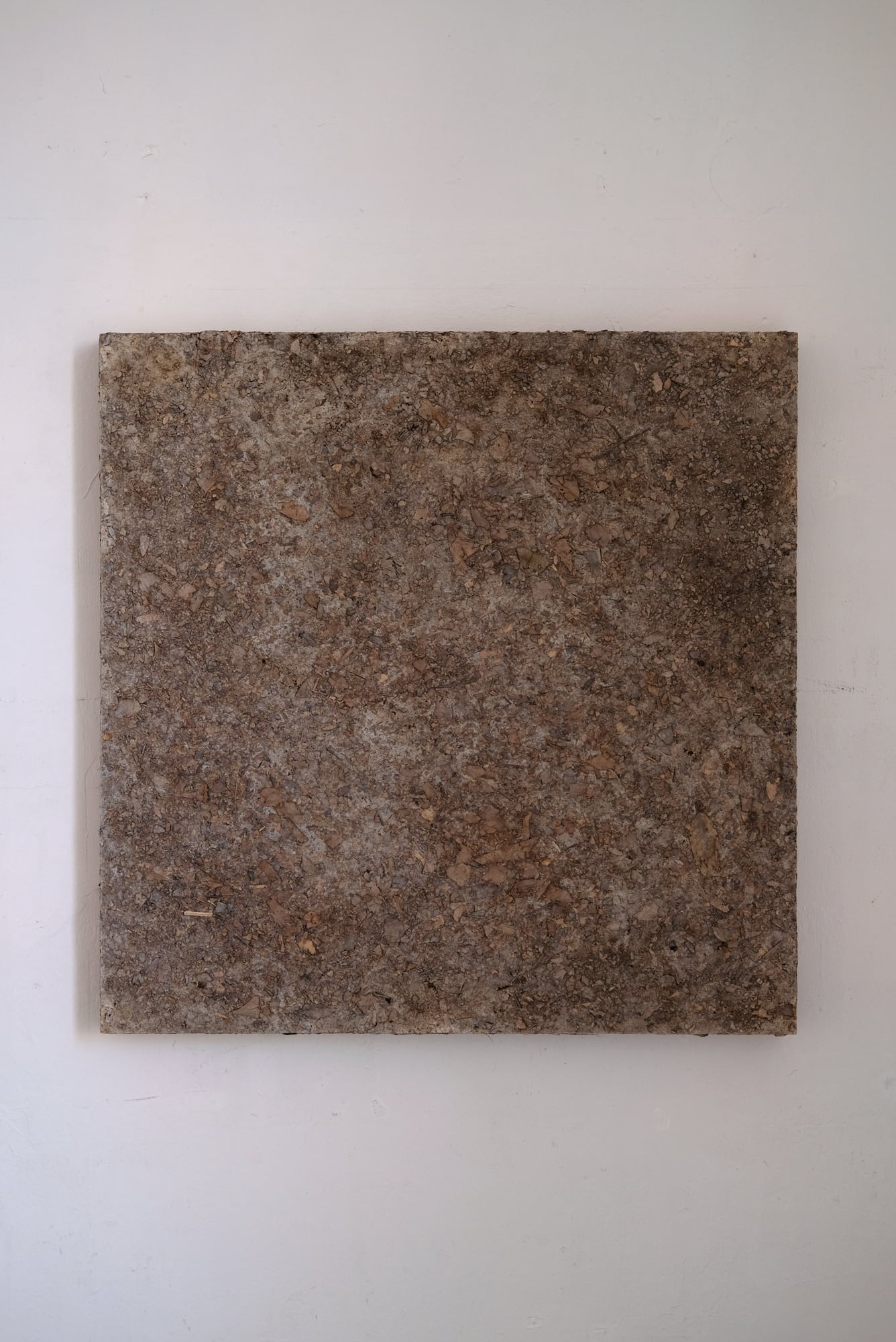 木製パネルに、手で揉んだ落ち葉を膠で幾層にも貼り重ねられた作品。