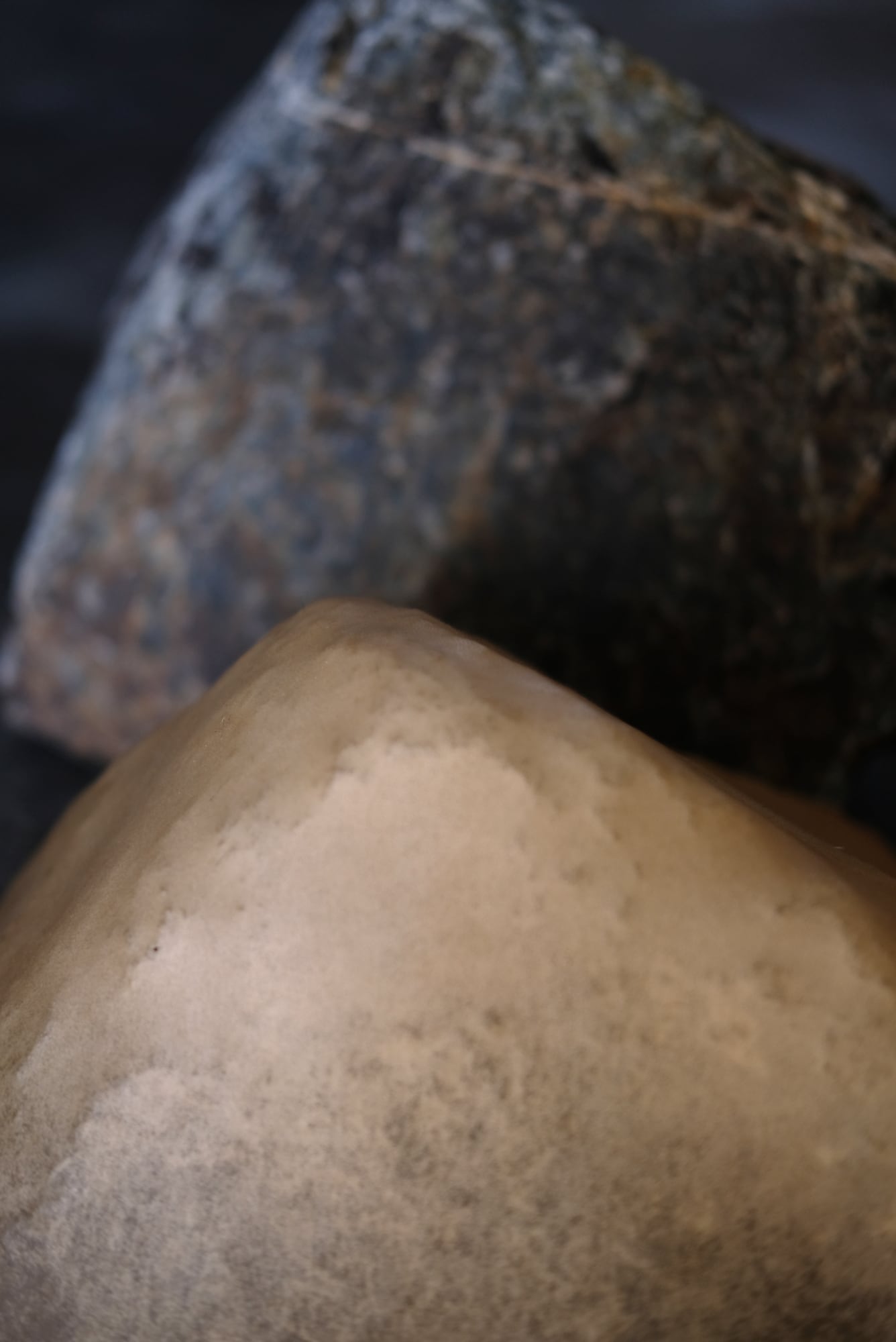 石そのものと、石の形を写し取った鹿皮の器状造形。石は実像、皮は虚像。しかし重ねれば一つの実となり、離せばそれぞれが独立した存在として成立します。薄い鹿皮は高い透化性を持ち、石の輪郭や光を柔らかく映し出します。乗せる、収める、離す、関係性の変化によって表情が変わります。